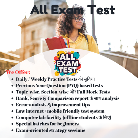 All Exam Test, Darbhanga एक भरोसेमंद Online & Offline Mock Test Platform है, जहाँ SSC, Banking, Railway, Defence, Bihar State Exams और अन्य Competitive Exams की तैयारी कराई जाती है। यहाँ छात्रों को real exam pattern पर आधारित mock tests, instant result, detailed analysis और expert guidance मिलती है, जिससे उनकी speed, accuracy और confidence में लगातार सुधार होता है।